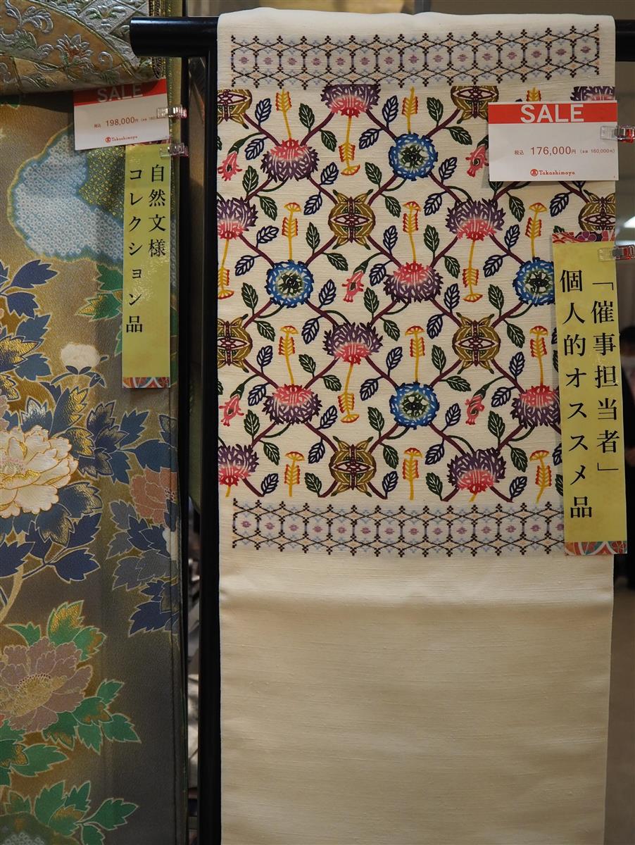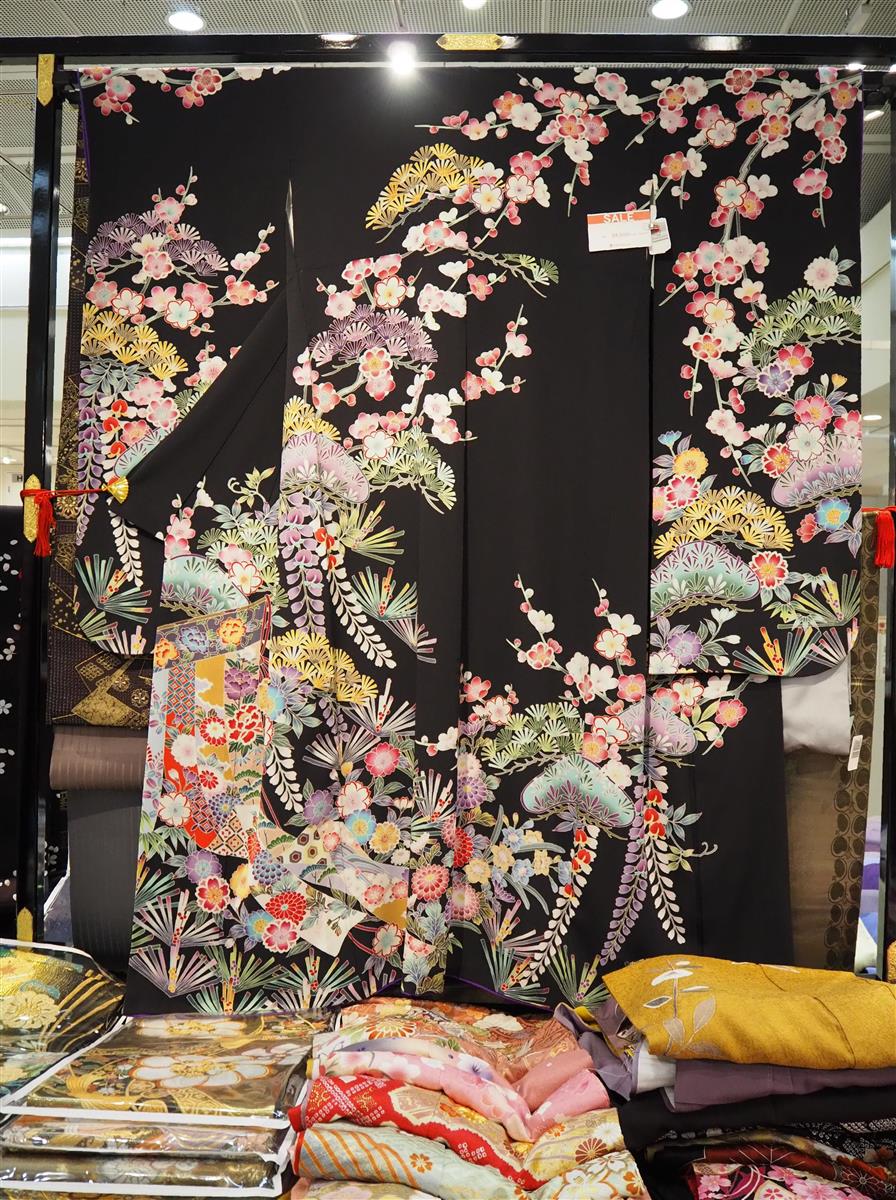 会場には、着付け動画で人気のユーチューバー「すなお」さんがコーディネイトした着物と帯のセット(本体価格2万円)や、華麗な加賀友禅の振り袖(8万8000円)などが目を引く。人間国宝の作家モノまである。