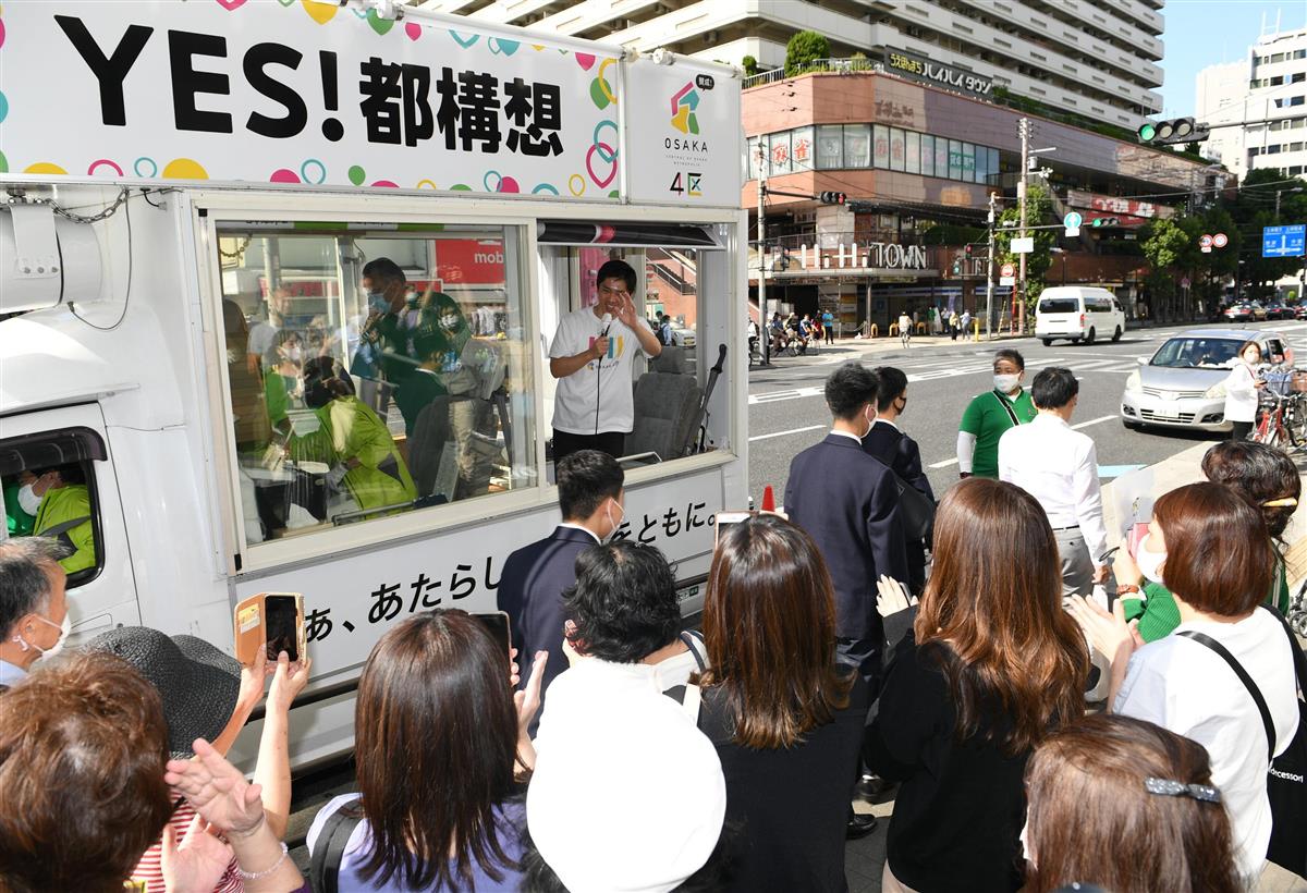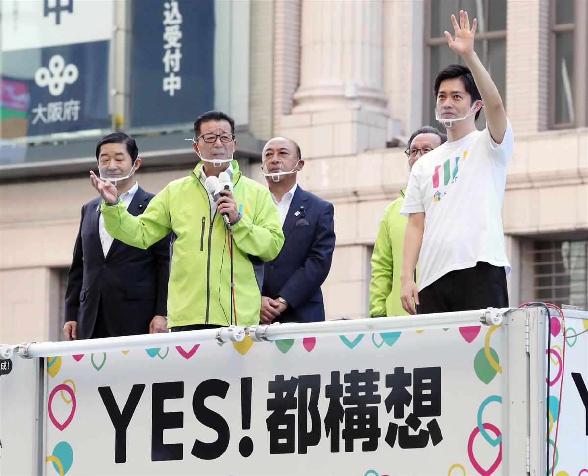 「本来なら大勢のみなさんに集まってもらいたいが…。事前告知はできないんです」。この日の街頭演説で、松井氏はこう釈明。松井、吉村両氏がマイクを握ると100人以上の聴衆が集まったが、新型コロナ前に維新が行った街頭演説に比べれば、その数はかなり少ない。2人は投開票日までそれぞれ全24行政区を回る予定だが、事前告知はせず、密を避けて住宅街などでゲリラ的に演説する予定だという。