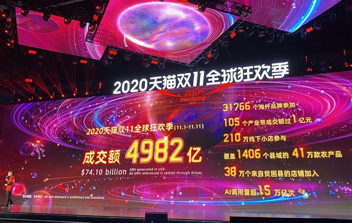 中国メディアによると、業界2位の京東集団(JDドット・コム)は、1~11日のセール期間中に記録した取引額が2715億元(約4兆3千億円)に上った。19年の2044億元を超えた。