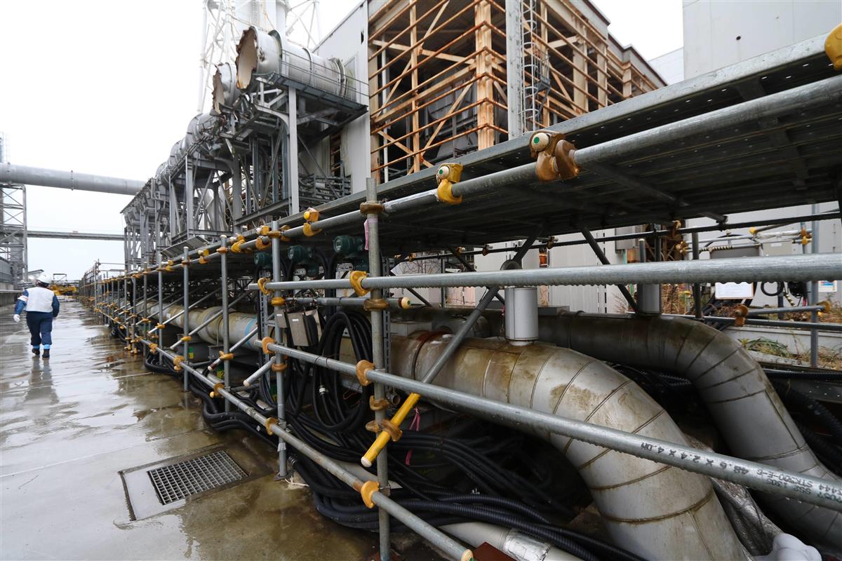 薄暗い内部は複雑な装置やパイプなどが並び、化学プラントのよう。照明を浴び鈍く光る設備の回りに、厳重な装備の人が並ぶと異様な雰囲気だ。「通常、原発にはない施設」。同行したスタッフの説明を聞き、深刻な事故が起きたことを改めて実感した。