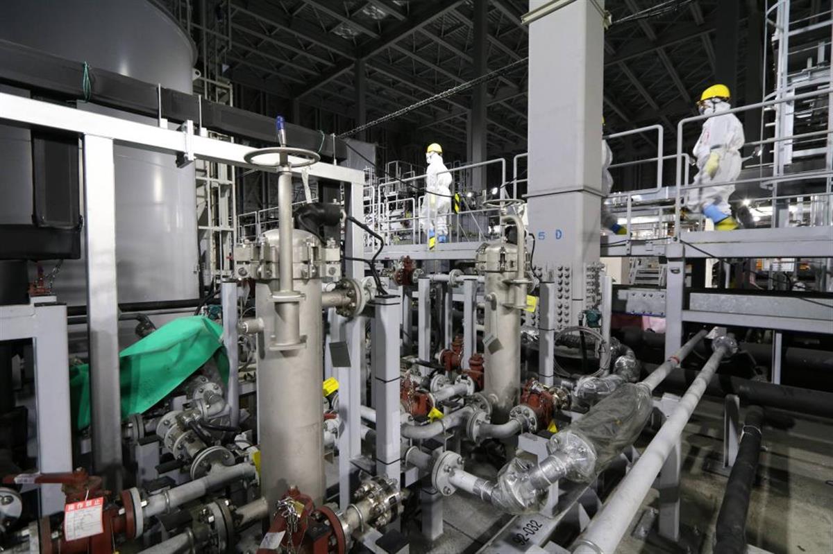 薄暗い内部は複雑な装置やパイプなどが並び、化学プラントのよう。ALPSでは吸着材が入った吸着塔に汚染水を通し、放射性物質を除去し処理水となる。しかし、トリチウムだけは残る。資源エネルギー庁などはトリチウムについて、自然界に存在し放射線も極めて弱く、被曝(ひばく)の心配はほとんどないと説明している。トリチウムは日本を含む世界各国の原発などで基準の濃度以下に希釈し排出されており、福島第1原発でも事故前から放出されていた。