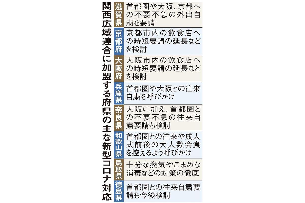 関西広域連合長を務める和歌山県の仁坂吉伸知事も首都圏への往来や成人式前後の大人数での会食を控えるよう呼びかける一方、飲食店への休業要請は「店で静かに楽しむ分まで目くじらを立てることはない」と見送った。飲食や買い物目的での大阪市への往来自粛を要請している奈良県も、飲食店に時短や休業は求めない方針。荒井正吾知事は「大都市と奈良は違う」としている。