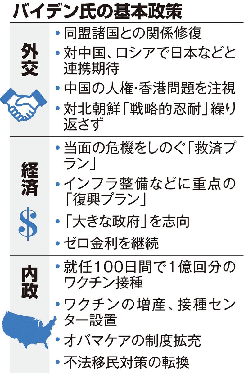 中間層に恩恵が行き届く経済を掲げるバイデン氏は弱者救済の「大きな政府」を志向。トランプ前大統領に奪われた労働者の支持を取り戻す思惑も透ける。