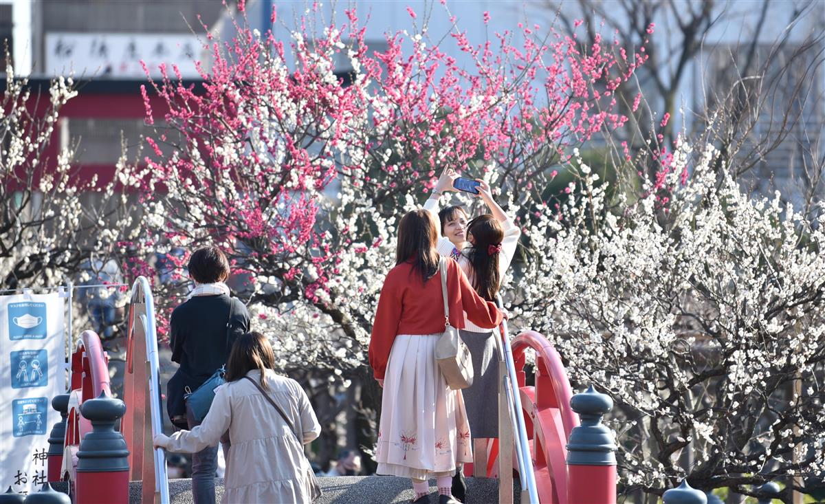 学問の神様として知られる菅原道真公をまつる亀戸天神社(東京都江東区)では梅の花が見頃を迎えた。江戸川区の女性は「ピンクや白がとてもきれい。こんなに薄着になったのは今年は初めて」と話した。