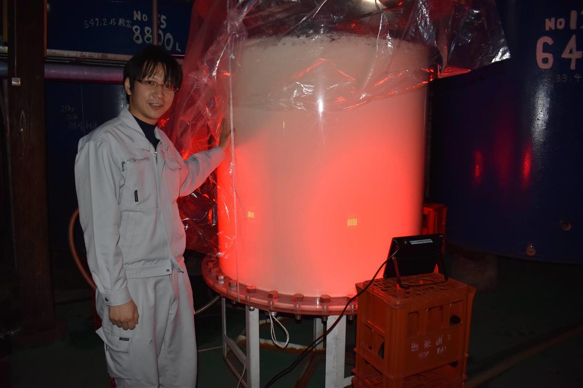 3月上旬、西堀酒造の真っ暗な蔵の中で、赤く光り続ける4基のLEDライト。品質への影響を考えて光を極力避けるのが常識の酒造りでLEDを照射する理由について、西堀酒造の6代目蔵元、西堀哲也さん(30)は「LEDは水耕栽培で太陽光の代わりとなっており、酒造りにも影響があるのではと考えた」と話した。