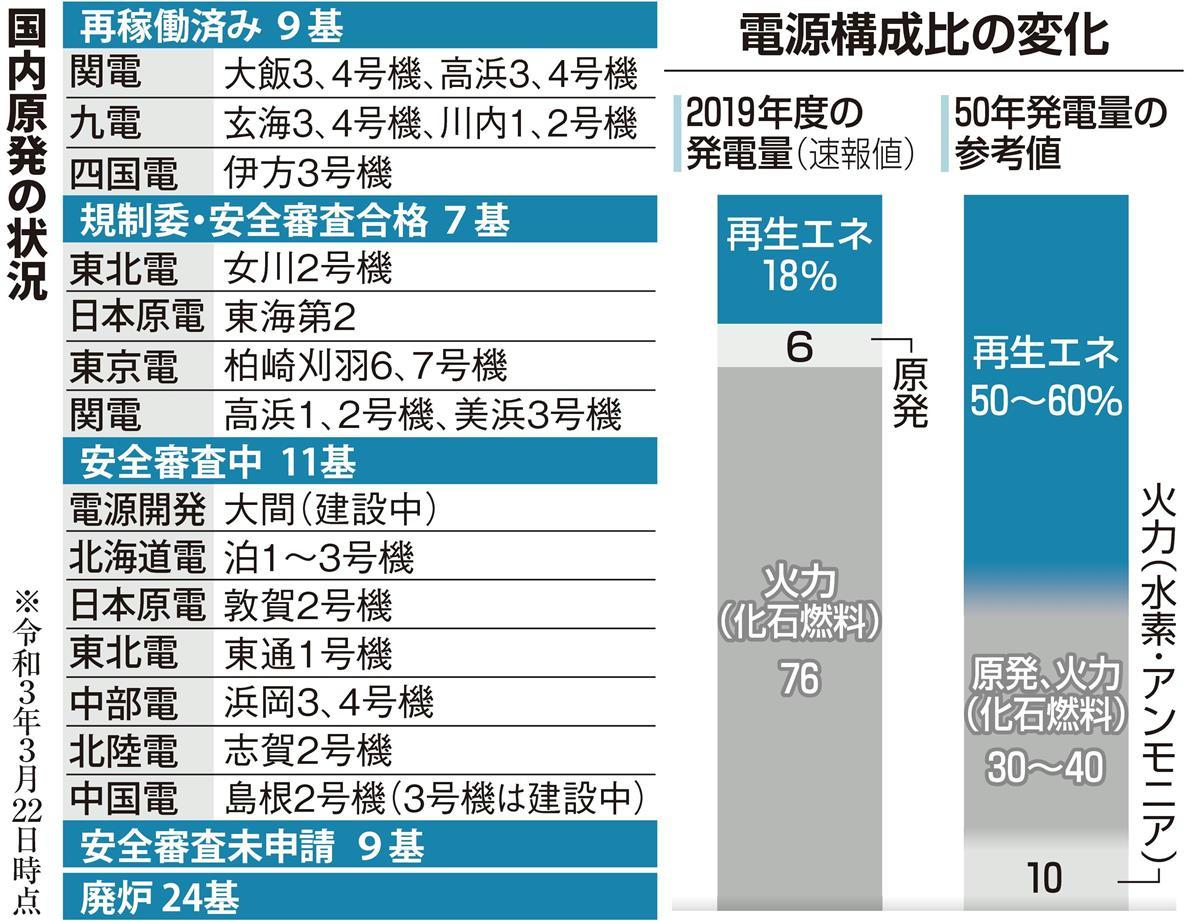 東日本大震災前、国内では54基の原発が稼働可能な状態にあった。震災後、原子力規制委員会が策定した新規制基準に合格し、再稼働できているのは9基のみで、電源構成比でみると原発は約6%(19年度速報値)を占めるにとどまっている。現行のエネルギー基本計画では、原発比率を30年度に20~22%に引き上げるとしているが、大きく乖離(かいり)しているのが現状だ。