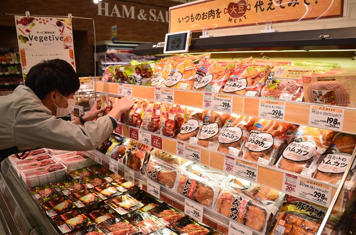 高層マンションが立ち並ぶ新興住宅地にあるイオン東雲店(東京都江東区)。1階の食品売り場に昨年3月からお目見えしたのは、大豆由来の「大豆ミート」を使用した商品などを集めた専用コーナー。並ぶのは自主企画商品を含めた約10品目で、主婦や帰宅途中の会社員らが足を止める。