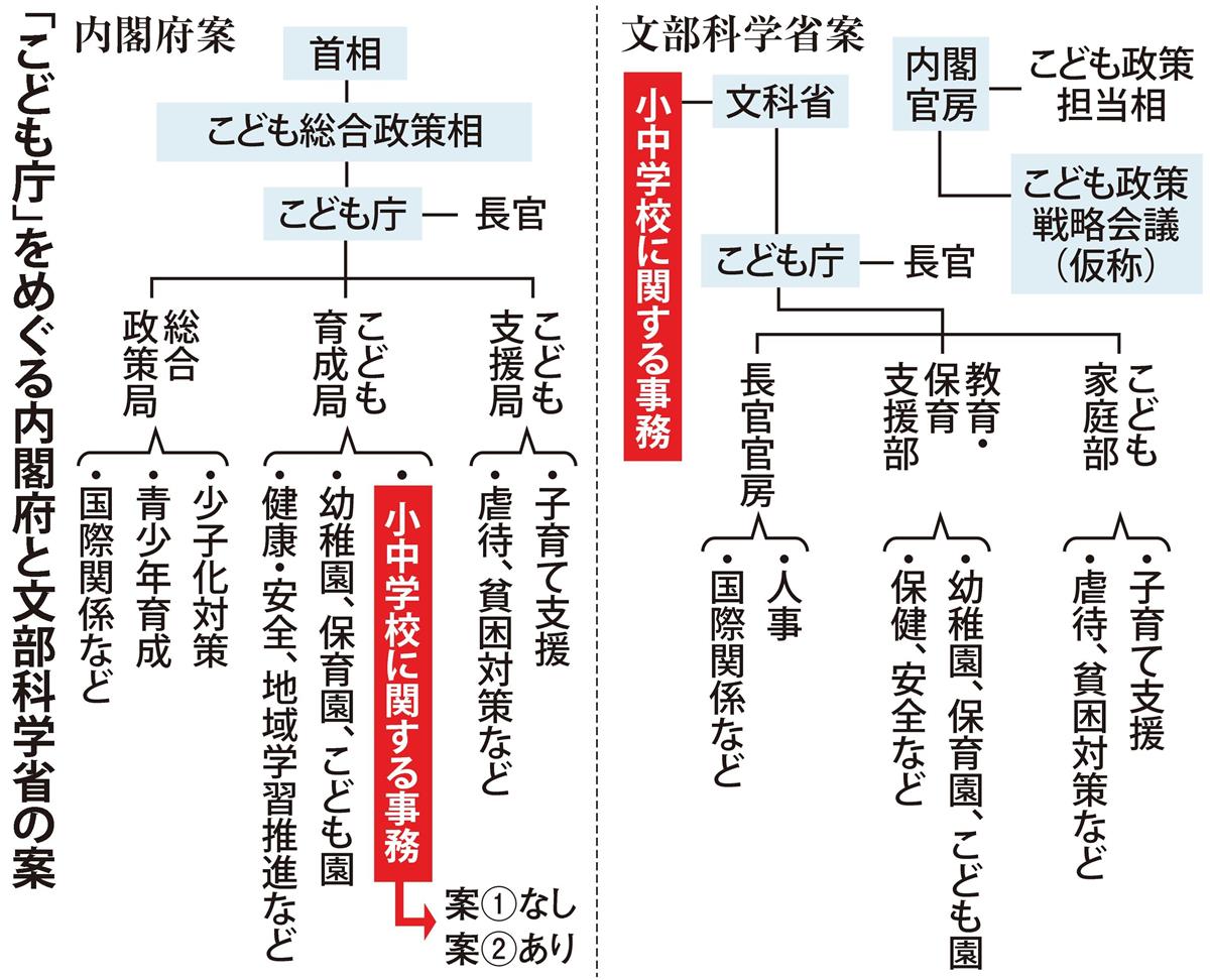 文科省案は、少子化対策や教育など各分野の総合調整機能を充実させるため、内閣官房に「こども政策戦略会議(仮称)」を新設して担当相を置く。文科省の下に「こども庁」を置き、幼稚園や小中学校、高校などを所管する初等中等教育局と、総合教育政策局から子供の福祉と保健に関連の深い業務を「こども庁」に移管し、その他は文科省に残す。