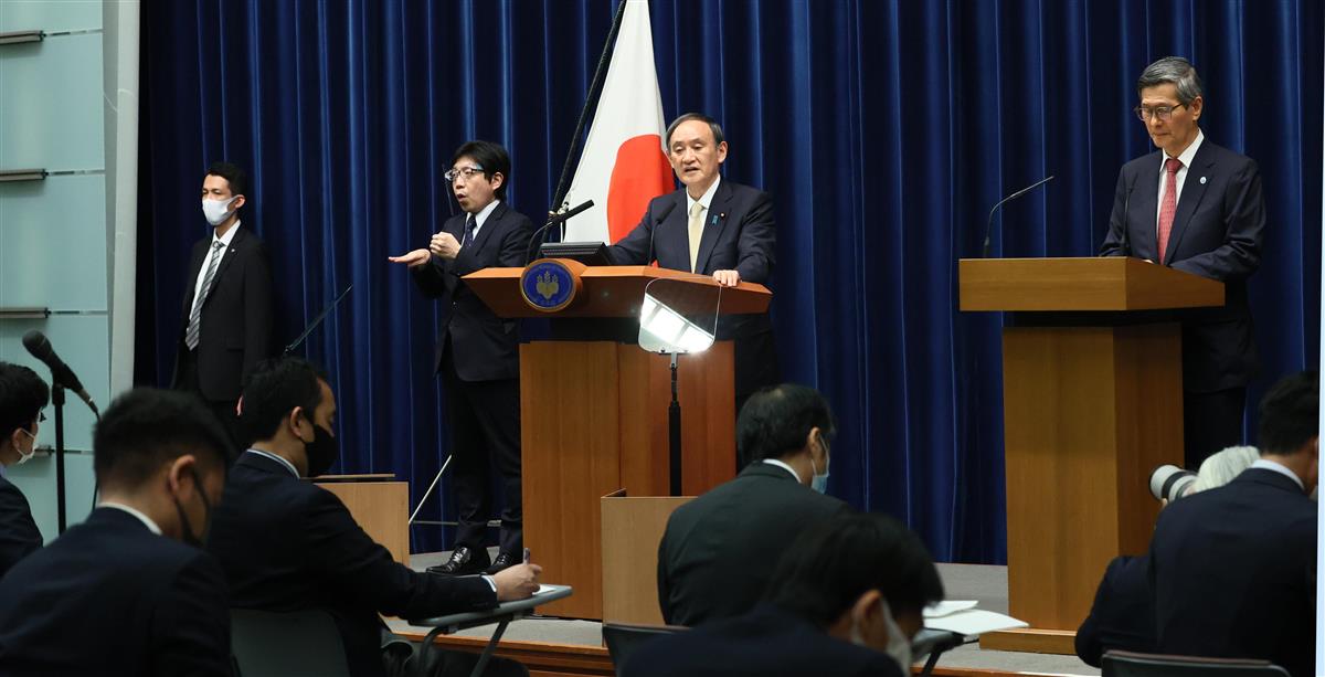 「先ほど、新型コロナ対策本部を開催をし、緊急事態宣言の発出を決定をいたしました。東京都、京都府、大阪府、兵庫県を対象として、期間は4月25日から5月11日までであります。また、蔓延(まんえん)防止等重点措置について、この期間において愛媛県を追加し、宮城県、沖縄県の5月11日までとすることを決定をいたしました。