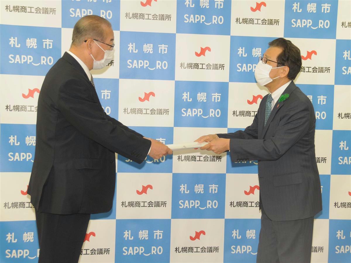 札幌市の秋元克広市長は18日、新型コロナウイルスの感染拡大防止に向けた人流抑制を進めるため、札幌商工会議所の岩田圭剛会頭にテレワークなどを求める緊急要請を行った。