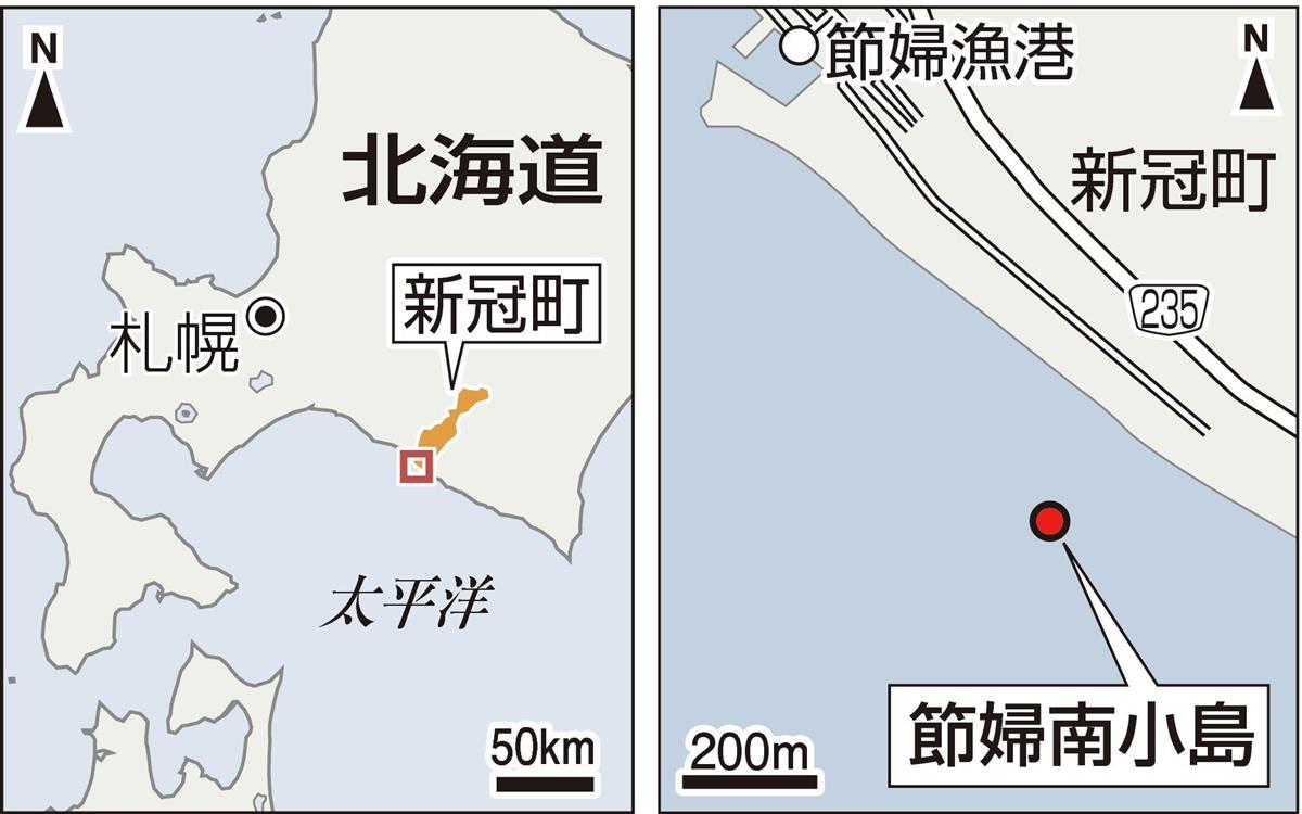 今回、調査が行われた節婦南小島は国土地理院の地図に記載され、新冠(にいかっぷ)町沖約200メートルに位置する無人島。地図上の面積は150平方メートル程度とみられる。