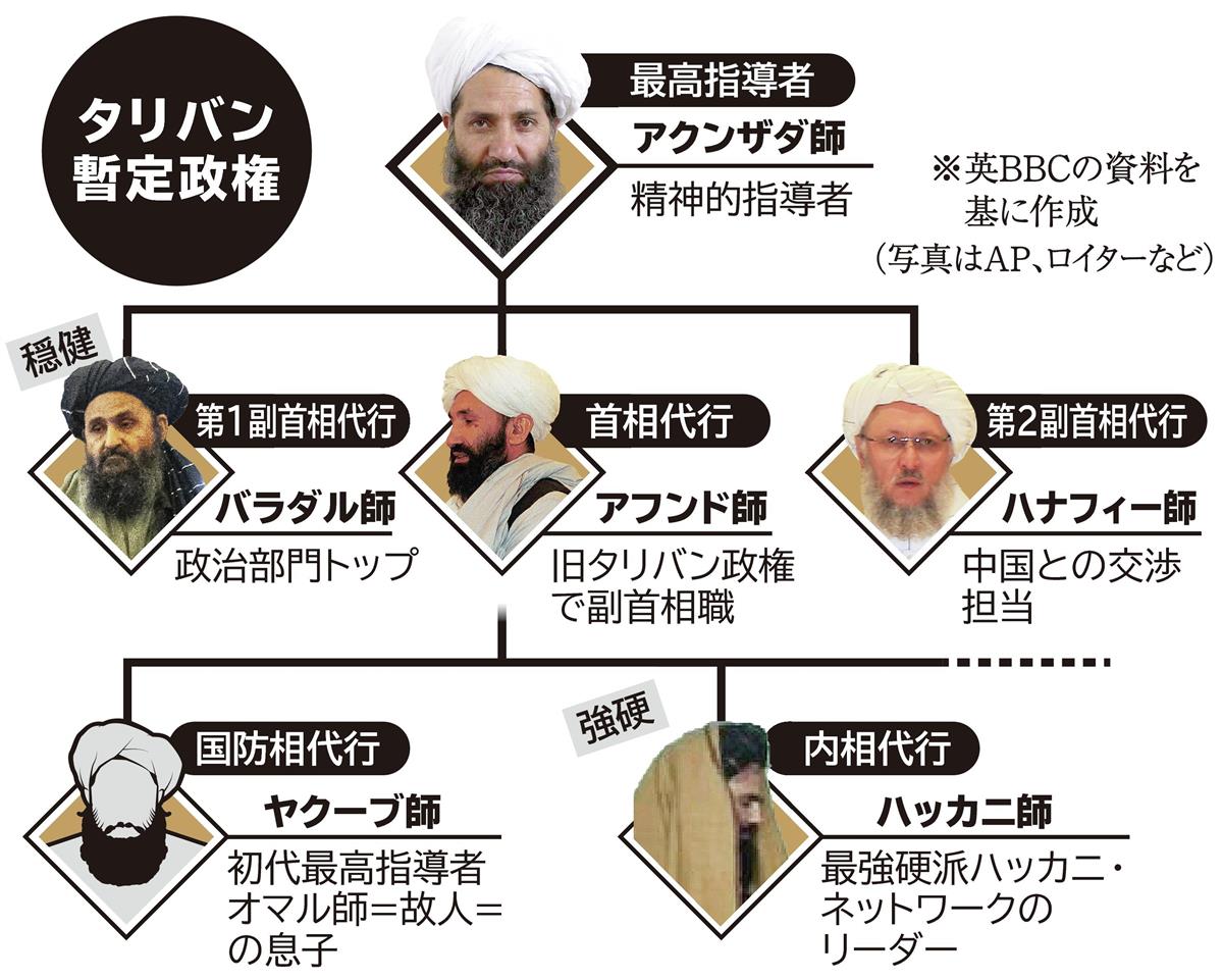 地元報道などを総合すると、タリバン内部では当初、穏健派とされる政治部門トップのバラダル師が首相職に就任する計画が浮上した。だが、国際社会との対話にも重きを置くバラダル師が新政権を主導することに対し、一部強硬派が反発していた。