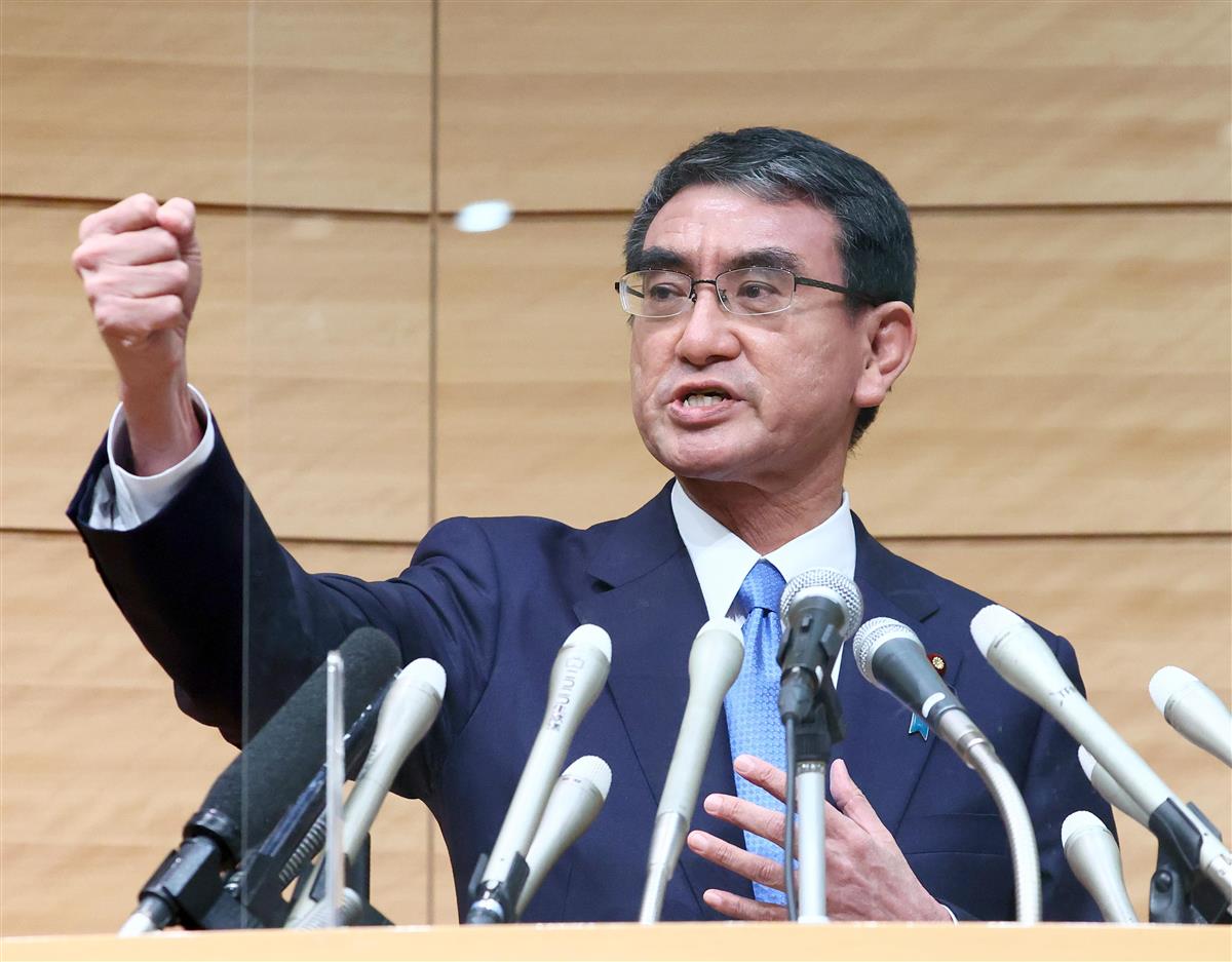 国内 河野氏が総裁選出馬正式表明「日本の礎は皇室」強調 2021.9.10 17:06 print mail 河野太郎ワクチン担当相は10日午後、国会内で記者会見を行い、自民党総裁選(17日告示、29日投開票)への立候補を正式に表明した。河野氏は「日本を前に進める」と訴え、保守主義の大切さに触れた上で「日本の礎は皇室と日本語だ」と強調した。 自民党総裁選への出馬表明を行う河野太郎行政改革担当相=10日午後、国会内(春名中撮影)