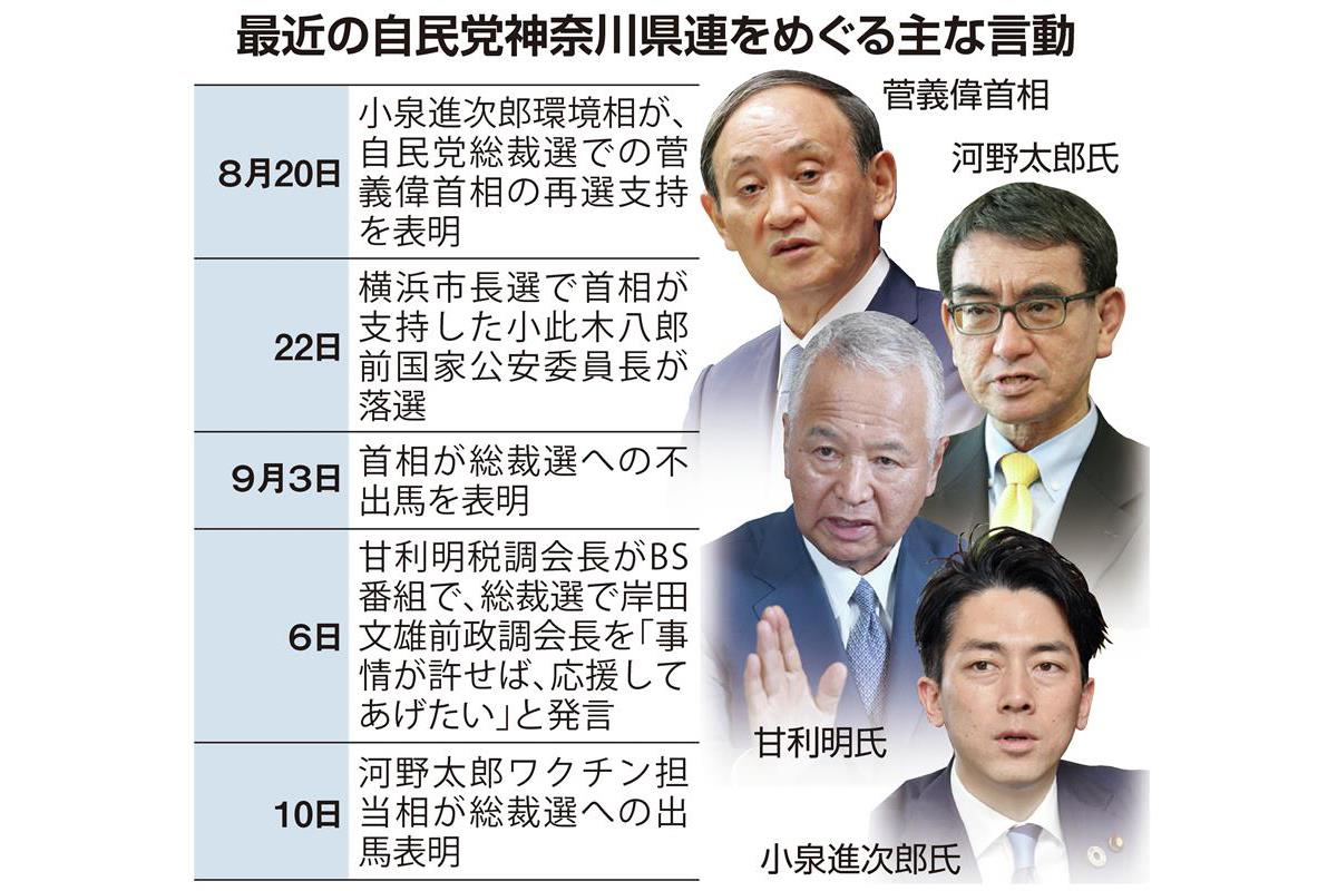 今回の自民党総裁選(17日告示、29日投開票)をめぐっては、「神奈川政局」との見方がある。不出馬を表明した菅義偉(すが・よしひで)首相=衆院神奈川2区=や出馬表明した河野太郎ワクチン担当相=同15区=だけでなく、河野氏への懸念を深める甘利明税調会長=同13区=ら、カギを握る人物が党神奈川県連の所属議員に集中しているからだ。