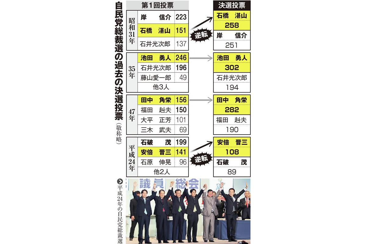 投票の形式は異なるが、自民党総裁選では過去4回、決選投票が行われた。第1回投票で2位だった候補が逆転した例は、安倍氏が勝利した平成24年を含め2回ある。