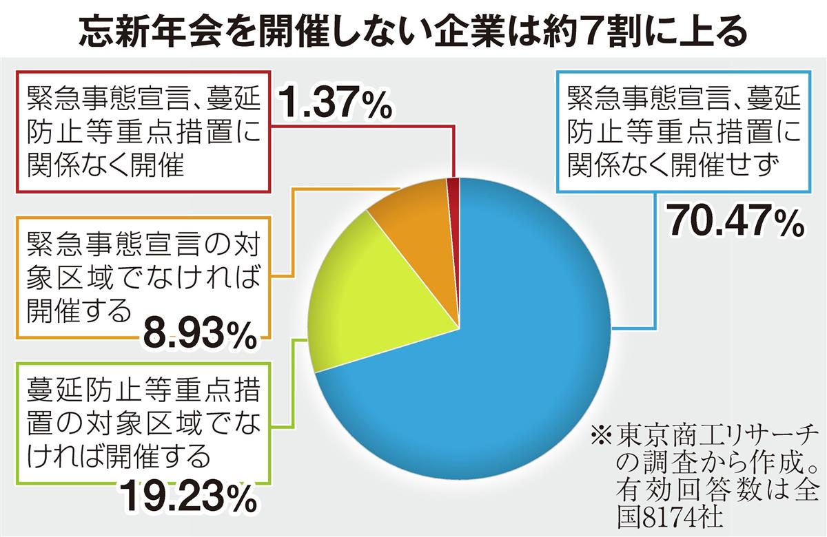 忘新年会シーズンへの期待も薄い。東京商工リサーチが企業に行った忘新年会の開催意向を聞く調査(有効回答8174社)によると、約7割が今年の年末年始は「開催しない」と回答した。同社情報本部の後藤賢治課長は「テレワークが続く中で忘新年会のためだけに社員を集めづらい」と分析する。