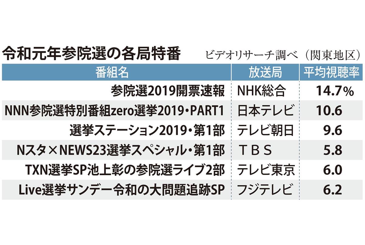 ビデオリサーチによると、前回の国政選挙である令和元年7月の参院選では、NHKの開票速報がもっともよく見られた。NHKは今回も大河ドラマを繰り上げ放送し、午後7時55分から開票速報番組を始める。キャスターを務めるのは、「ニュース7」を担当する瀧川剛史アナと上原光紀アナ。正籬聡(まさがき・さとる)放送総局長は20日の定例会見で、「NHKのネットワークを生かして全国各地の選挙事務所を中継でつなぎ、解説委員の分析なども交え、深く多角的に報道したい」と抱負を語った。