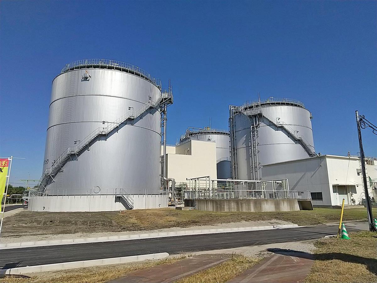 県が新設した汚泥処理施設は、高さ約26メートルの汚泥消化タンク4基、同約25メートルのガスタンク2基などからなる。