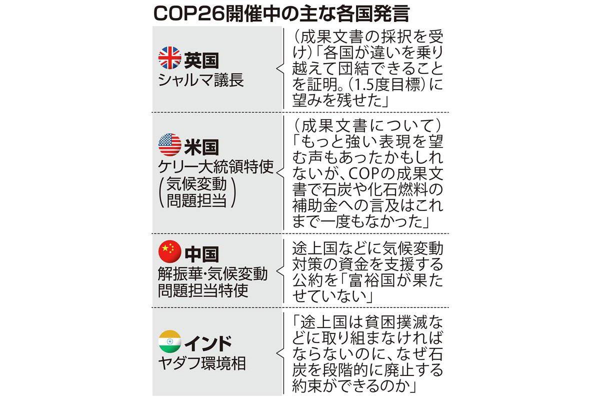 会議の期間中、途上国からは、先進国が途上国などの気候変動対策に年間1000億ドル(約11兆円)を支出するとした目標が未達成であることへの不満が続出していた。中国は先進国による支援が不足していると訴えて途上国の支持を固めてきただけに、「(議長国の)英国は中国の発言を無視できなくなった」(英元下院議員)とみられる。