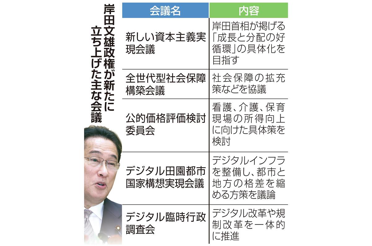 首相が就任後に立ち上げたのは、新しい資本主義実現会議▽デジタル田園都市国家構想実現会議▽デジタル臨時行政調査会(臨調)▽全世代型社会保障構築会議▽公的価格評価検討委員会-の5つの会議。議論するのは、いずれも首相が就任前から温めてきた看板政策だ。