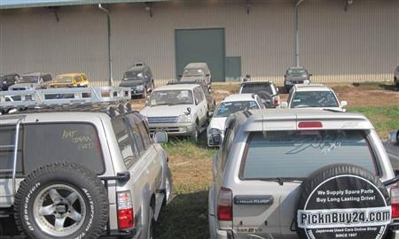 通関待ちのため停車している中古車。日本からの輸入中古車は昨年1年間で9万3千台にも及ぶ(栢下邦彦さん提供)
