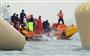 18日、海面から完全に姿を消した旅客船「セウォル号」の沈没地点に設置されたブイとクレーン船(奥)=韓国南西部・珍島沖(共同)