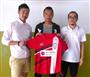 Jリーグ山形、同仙台でプレーした大久保剛志選手のタイ・プレミアリーグ「バンコクグラス」入団会見。右が真野浩一さん=バンコク郊外(真野さん提供)