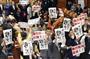 衆院平和安全法制特別委員会で、採決反対のプラカードを手にする野党議員=15日午後、国会・衆院第1委員室(斎藤良雄撮影)