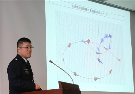 事前説明で公開された先進技術実証機の高運動技術(イメージ)=28日午後、愛知県豊山町(彦野公太朗撮影)