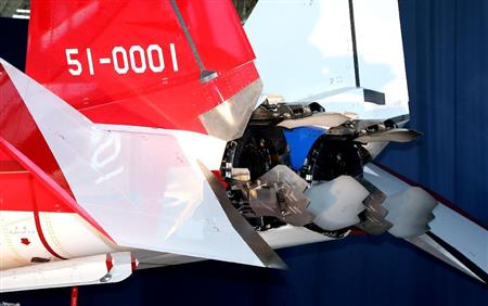 公開された先進技術実証機のエンジンノズル付近=28日午後、愛知県豊山町(彦野公太朗撮影)