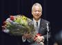 退任のあいさつを終え、職員と握手を交わして退出する甘利前経済再生相=29日午前、内閣府