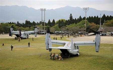 熊本地震で救援物資を届けるため被災地に到着した米軍垂直離着陸輸送機MV22オスプレイ=18日午後、熊本県南阿蘇村(松本健吾撮影)