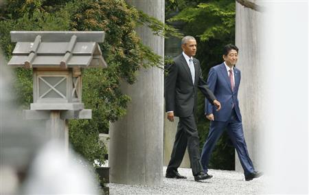 【伊勢志摩サミット共同通信代表撮影】サミット開幕し、訪問した伊勢神宮の参道を歩くオバマ米大統領(左)と安倍首相=26日午前11時13分、三重県伊勢市(代表撮影)
