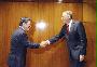 閣僚級の貿易協議に臨む茂木経済再生相(手前左)とライトハイザー米通商代表(同右)=25日、米ニューヨーク(代表撮影・共同)