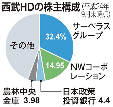 西武HDの主力取引銀行のみずほコーポレート銀行や日本政策投資銀行、農林中央金庫など、株式の2~4%を保有する主要株主はTOBに否定的だ。サーベラスに次ぐ約15%を保有する西武グループ総帥だった堤義明氏が大株主のNWコーポレーションも、TOBに応じない意向という。