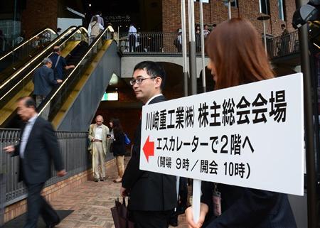 川崎重工業の株主総会会場に入る株主ら=6月26日、神戸市中央区(大塚聡彦撮影) 神戸市内で26日開かれた川崎重工業の定時株主総会では、三井造船との経営統合の交渉白紙化と前社長ら取締役3人の電撃解任について質問が集中した。多くの株主が口にしたのは、意外にも交渉白紙化に対する好評価だった。株主の関心は“クーデター”そのものよりも、川崎重工が単独で生き残れるか、成長戦略をどう描くのかという点に移ったようだ。
