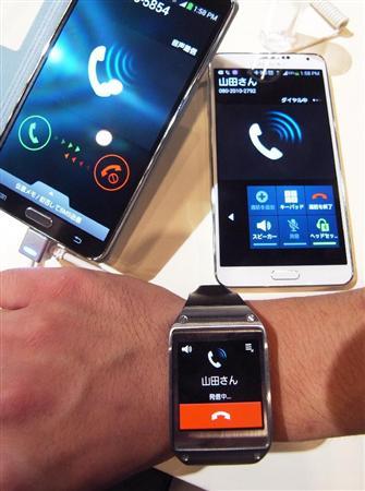 韓国サムスン電子は16日、NTTドコモとKDDI(au)から17日に発売される腕時計型の情報端末「ギャラクシーギア」(3万6540円)を報道陣に公開した。サムスンは「新しいスマートフォン(高機能携帯電話)生活を実現するツール」(幹部)として、腕時計型端末で先行するソニーに対抗する。