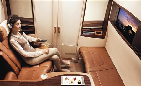 特筆すべきは、シンガポール航空だけの特別仕様クラスである「スイート」。12席限定の「スイート」は、贅沢さとプライバシーを徹底的に追求している。それぞれのキャビンは、スライドドアで仕切られプライベート空間を確保。室内のシートは、業界初の完全独立型ベッドとなった。