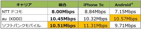 名古屋市内の平均下り速度調査結果(角川アスキー総合研究所調べ) リサーチメディアの角川アスキー総合研究所は22日、NTTドコモ、KDDI、ソフトバンクモバイルの携帯大手3社の「iPhone 5c」とアンドロイド端末を対象に、名古屋市内50カ所で通信速度を実測した結果を発表した。「iPhone 5c」と総合の2項目において平均下り(受信時)速度でドコモがトップとなった。