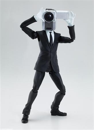 カメラ男とパトランプ男のフィギュアはともに3240円(8%税込)。ABS樹脂・ポリ塩化ビニル製で、高さ約15センチ。大きさをそろえたので、例えばCMのように、盗撮するカメラ男をパトランプ男が取り押さえるような姿勢を再現して遊んだり飾ったりすることができる。交換用のパーツなども付ける。