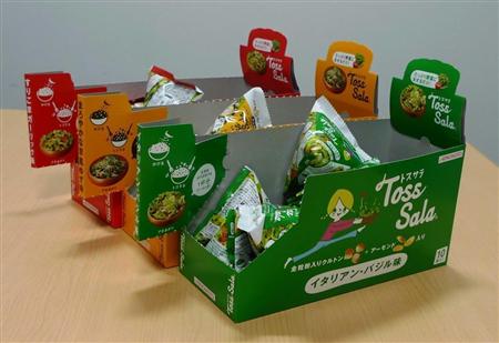 さまざまな商品アイデアが練られたが、サラダドレッシングという身近すぎる商品のため、“いつもと違った感じ”の演出が難しかった。浮上してきたのは、トッピング入りのサラダ用シーズニング。ザルに入れてサッと振った野菜にかけて“トスする”(交ぜる)だけで、彩りの良いおしゃれなサラダが出来上がる。「サラダは野菜の水切りが面倒」という声を逆手にとったアイデアだが、交ぜた瞬間に立ち上がる豊かな香りは粉タイプならではの特徴だ。