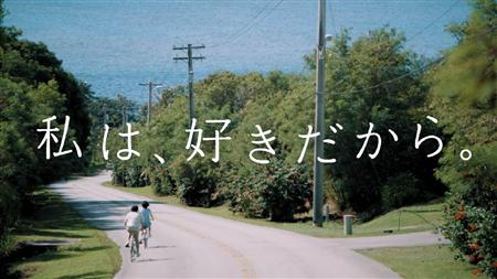 舞台は、照りつける太陽の下、真っ青な海が眼下に広がる坂道。若い男女2人が、自転車に乗って駆け下りていく。