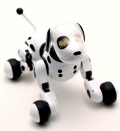 犬型の「ハローズーマー」は音声認識機能を装備し、「おすわり」「ふせ」などの命令に応えて、動作する。英語モードも装備している。