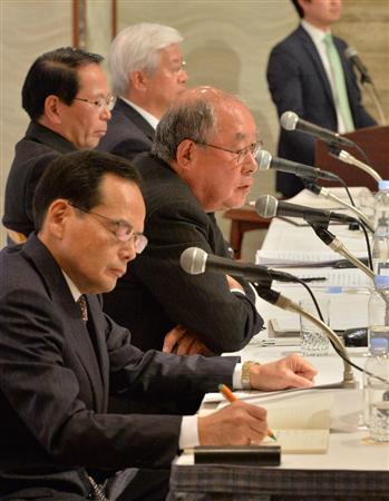 イオンが出資する食品スーパー3社が統合を発表し、撮影に応じる(左から)カスミの小浜裕正会長、マルエツの上田真社長、丸紅の秋吉満副社長、イオンの岡田元也社長=19日午後、東京都千代田区(三尾郁恵撮影) イオンと丸紅は、出資する食品スーパー3社を経営統合させることで合意したと19日午後、発表した。イオンの100%子会社であるマックスバリュ関東と、首都圏を地盤とするマルエツ、茨城県を中心に展開するカスミの3社で、「首都圏におけるスーパーマーケット連合(首都圏SM連合)」を来年3月に発足させる。