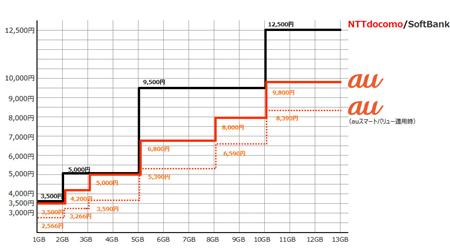 一方、auの新サービス「データ定額」は容量を2GBから13GBまで6段階に小刻みに分けたことで「(従来プランよりも)かなりの人が安くなるのではないか」(田中社長)と自信を示す。3GB、8GB、13GBは同社でしか選べない。月間のデータ容量を超過した時点でリアルタイムに0.5GB、1GB単位で追加で購入できる「データチャージ」の新サービスも同時にスタートする。