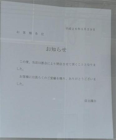 「お客様には長らくのご愛顧を賜り、ありがとうございました」。和歌山市駿河町の本店「駿河町本舗」はカーテンが下ろされ、張り紙だけが寂しく残っている。