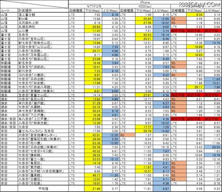 ドコモが全44地点で高速データ通信「LTE」回線が使えたのに対し、auはiPhone、Androidともに1地点が3G回線だった。ソフトバンクに至ってはiPhone、Androidともに測定不能が3地点あり、残りの地点も半数近くが3G回線だった。