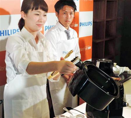 フィリップスエレクトロニクスジャパンが9月に発売する、油を使わずに揚げ物ができる調理家電「ノンフライヤープラス」=19日、東京都中央区(黄金崎元撮影) フィリップスエレクトロニクスジャパン(東京都港区)は19日、油を使わずに揚げ物ができる調理家電「ノンフライヤープラス」を9月上旬に発売すると発表した。同社は昨年からノンフライヤーを発売しているが、今回、日本の消費者の声を反映した機能を搭載した新商品を投入する。市場想定価格は3万2200円前後(税抜き)。年末までに8万台の販売を目指す。