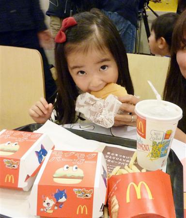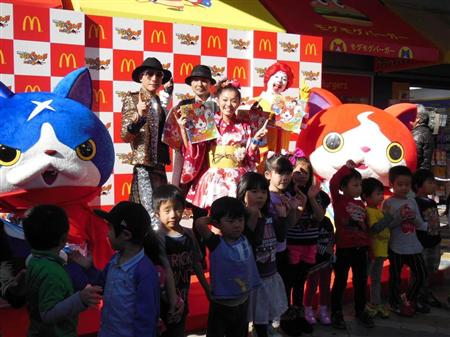 「妖怪ウォッチ」とコラボした日本マクドナルドのオープニングイベント=29日、東京都港区(平尾孝撮影) 日本マクドナルドは29日、人気のゲーム・アニメ「妖怪ウォッチ」とコラボしたハンバーガーショップを東京・台場にオープンした。11月11日までの期間限定で、同アニメなどに登場する架空のショップ「モグモグバーガー」を再現している。