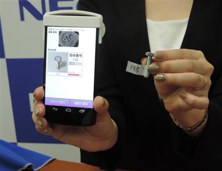 NECが開発したスマホを使った識別技術は、1000本のボルトをすべて認識できる=10日、東京都港区(黄金崎元撮影) NECは10日、スマートフォンのカメラで、ブランド品や工業製品の微細な紋様を認識し、本物かどうか判別できる認証技術を開発したと発表した。製品の紋様をベースにした識別技術は世界で初めてで、NECは製造業や流通業などでサービスの活用を目指す。